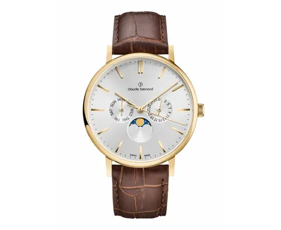 Швейцарские часы Claude Bernard 40004 37J AID Коллекция: Slim Line Moon Phase. Пол: Мужские. Часовой механизм: Кварцевый. Материал корпуса часов: Нержавеющая сталь с покрытием PVD. Стекло: Сапфировое. Тип браслета/ремня: Ремешок из кожи теленка. Водозащита: 5 ATM. Циферблат: Серебристый. Функции: часы, минуты, секунды, дата, день недели, фаза луны. Размеры корпуса: диаметр 41 мм, высота 8.3 мм. Гарантия 24 месяца!