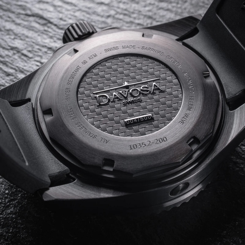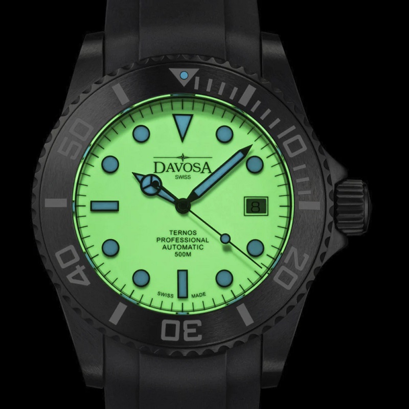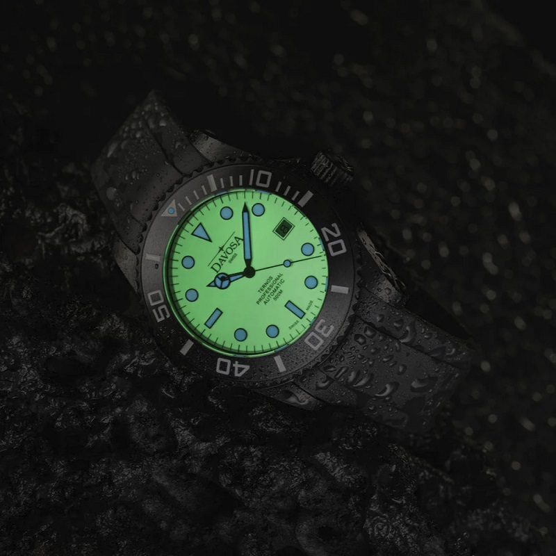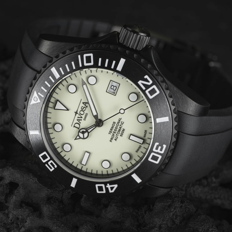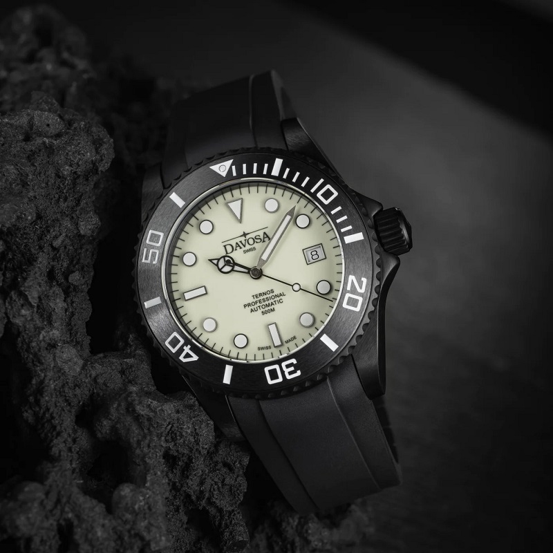 Швейцарские часы Davosa 161.583.10 Коллекция: Ternos Professional Megalume. Пол: Мужские. Часовой механизм: Механический с автоподзаводом. Материал корпуса часов: Нержавеющая сталь с чёрным сатинированным PVD покрытием, керамический безель. Стекло: Сапфировое антибликовое. Тип браслета/ремня: Каучуковый ремешок с раскладывающейся застёжкой и удлинителем для дайвинга. Водозащита: 50 ATM. Циферблат: Бежевый со сплошным. покрытием SuperLumiNova. Калибр механизма: ETA 2824-2. Функции: часы, минуты, секунды, дата, завинчивающаяся заводная головка, гелиевый клапан, стрелки и метки с покрытием SuperLumiNova® BGW9. Диаметр корпуса: 42 мм. Лимитированная серия: 500 экземпляров -. индивидуальный номер выгравирован. на задней крышке каждых часов, среди рельефа из стилизованного углеродного волокна, а также указан в сертификате, прилагаемом к часам. Гарантия 24 месяца!. ДА БУДЕТ СВЕТ. ДВОЙНОЕ СВЕЧЕНИЕ С SUPERLUMINOVA®. Для достижения максимальной яркости, по всей поверхности циферблата. часов, выпущенных ограниченной серией в 500 экземпляров, использовалась люминесцентная краска SuperLumiNova® C3. Днем теплый бежевый тон напоминает мелкозернистый песок популярных мест для дайвинга. В темноте после соответствующей зарядки загорается ультра фосфоресцентный зеленый свет, который хорошо различим от цифр, стрелок и светящейся точки на безеле. Индексы и стрелки. излучают холодный синий свет благодаря наполнению SuperLumiNova® BGW9. Инновационный состав светящихся пигментов гарантирует идеальную читаемость в ночное время, что так важно для часов профессионального дайвера. Водостойкий корпус 50 АТМ с автоматическим гелиевым клапаном и антибликовым, устойчивым к царапинам сапфировым стеклом, а также матовый безель из высокотехнологичной керамики визуально отходят на второй план благодаря черному PVD покрытию. Интегрированный в корпус каучуковый ремешок с удлинителем для дайвера подчеркивает неповторимый характер Ternos Professional Megalume.